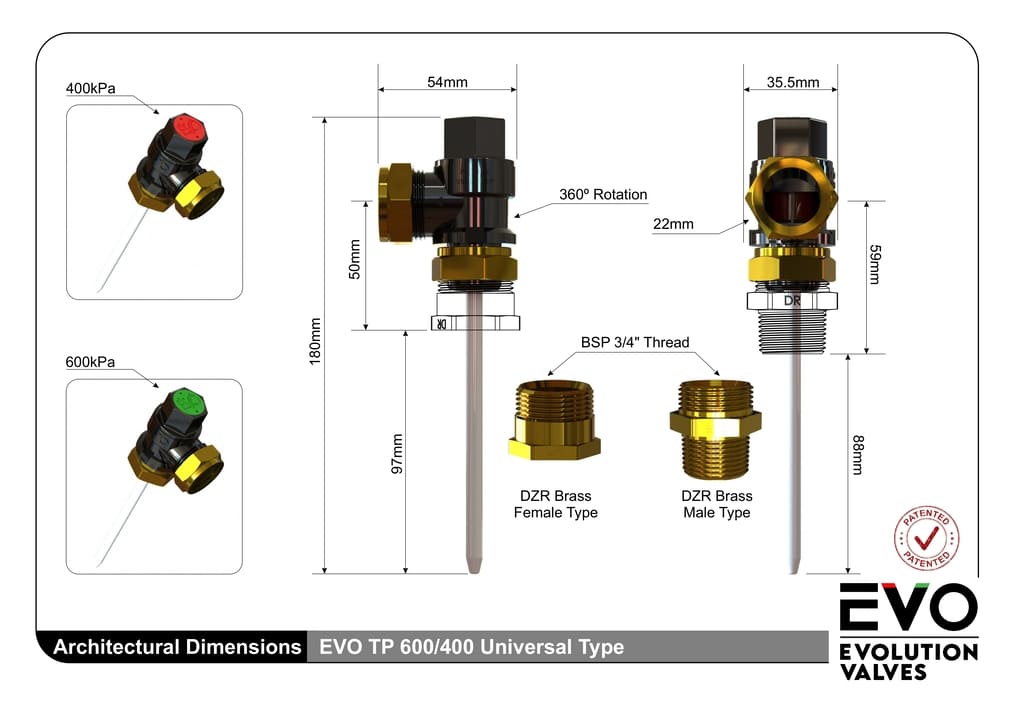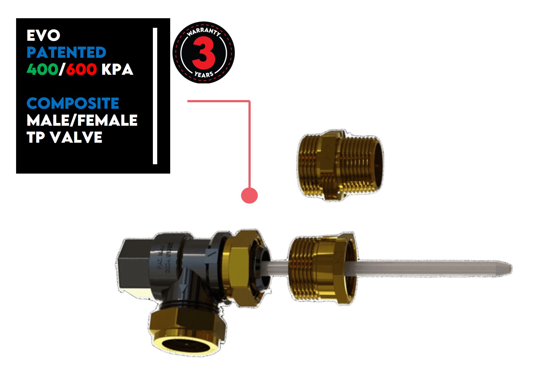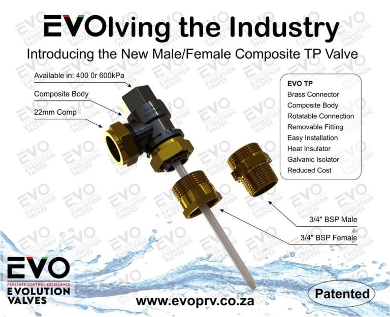 Engineered to revolutionize geyser safety, the patented EVO TP Valve combines pressure and temperature control in one compact, modular unit. Designed for 400 or 600kPa systems, this 22mm composite valve features a unique rotatable and removable configurationβallowing it to adapt as either a male or female connection on-site. This patented flexibility drastically simplifies installation, inventory management, and replacement. With a composite body offering heat and galvanic isolation, the EVO TP not only prevents corrosion and leakage but also reduces the likelihood of costly water damage or ceiling collapse. Built with plumbers in mind and insurers at heart, itβs a premium, locally manufactured solution that supports fast servicing and long-term peace of mind. The EVO TP is a smart investment for modern plumbing systemsβfully certified, proudly South African, and backed by a 3-year warranty.