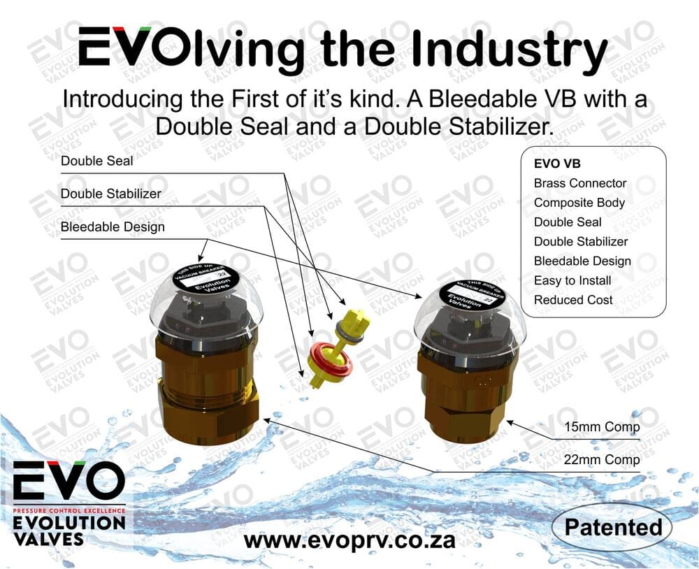 The EVO VB is South Africaโs first-of-its-kind flushable vacuum breaker featuring a double-seal mechanism and dual internal stabilizers for maximum reliability. Unlike traditional vacuum breakers, the EVO VB can be flushed in situ โ allowing for maintenance without full removal. This reduces blockages, extends lifespan, and ensures continued compliance with SANS standards for geyser safety and anti-siphonage. Its patented composite-and-brass body resists corrosion and offers superior performance at a reduced cost. Available in 15mm and 22mm compression fittings, the EVO VB is compatible with all standard installations and offers an insurance-friendly design that supports proactive serviceability, saving on long-term replacements. Precision-engineered and proudly local, itโs the most advanced VB solution ever released in the market.